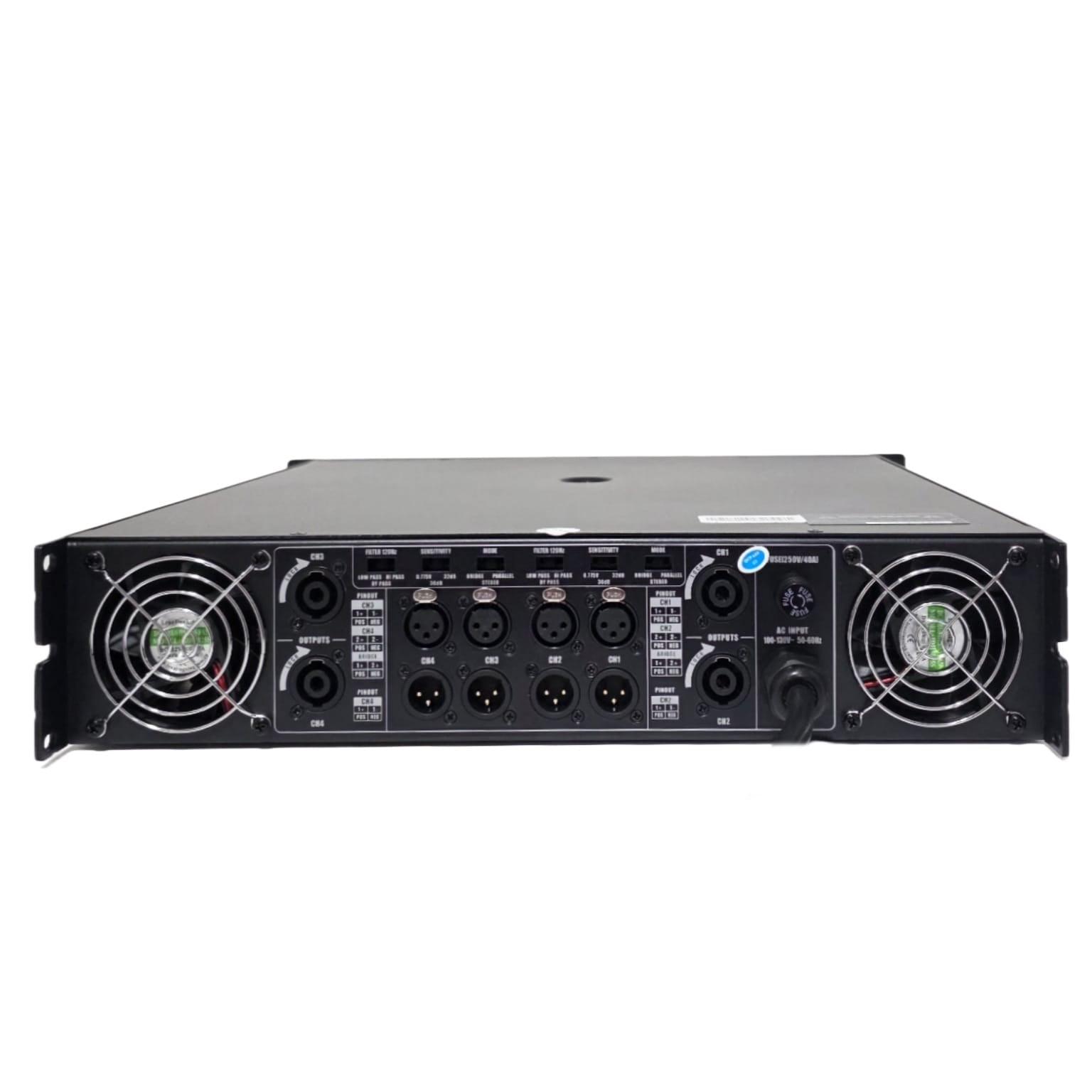 El amplificador PRO DJ V10.4 ofrece una potencia impresionante con 4 canales que entregan hasta 1500 W a 4 ohmios y 3000 W en modo puente a 4 ohmios, garantizando un rendimiento sólido para aplicaciones profesionales. Incorpora múltiples sistemas de protección — incluyendo contra cortocircuitos, sobrecalentamiento, sobrecargas y arranque suave — para asegurar la integridad del equipo y la seguridad operativa. Su gestión inteligente de la temperatura y el sistema A-Guard permiten un funcionamiento confiable incluso en condiciones exigentes. Con conectores XLR y Speakon, además de sensibilidad y respuesta de frecuencia optimizadas, es ideal para controlar con precisión sistemas de sonido avanzados.